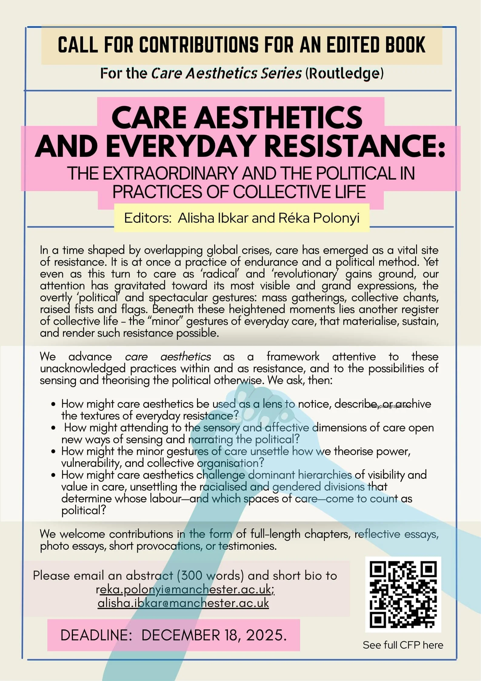 We are busy launching the first global network for the study of care aesthetics - or of the deeply relational, embodied, sensorial aspects of care practices. Our first meeting, held online in February 2026, is bringing together scholars from various fields of discipline, and across a wide geogpraphical landscape. We will have information soon.